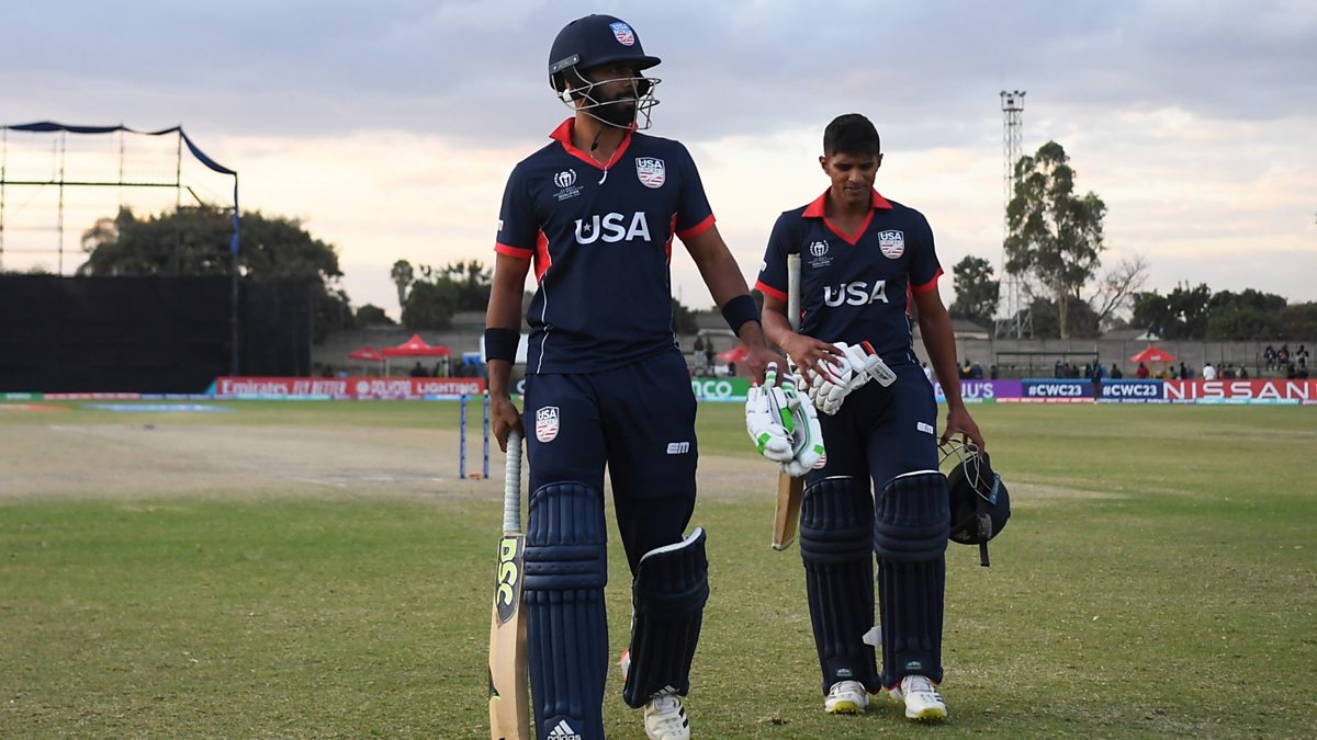 Image: Ali Khan and Nosthush Kenjige of USA make their way off following the ICC Men's Cricket World Cup Qualifier Zimbabwe 2023 9th and 10th Playoff match between USA and UAE at Takashinga Cricket Club on July 06, 2023 in Harare, Zimbabwe. (Photo by Alex Davidson-ICC/ICC via Getty Images)
