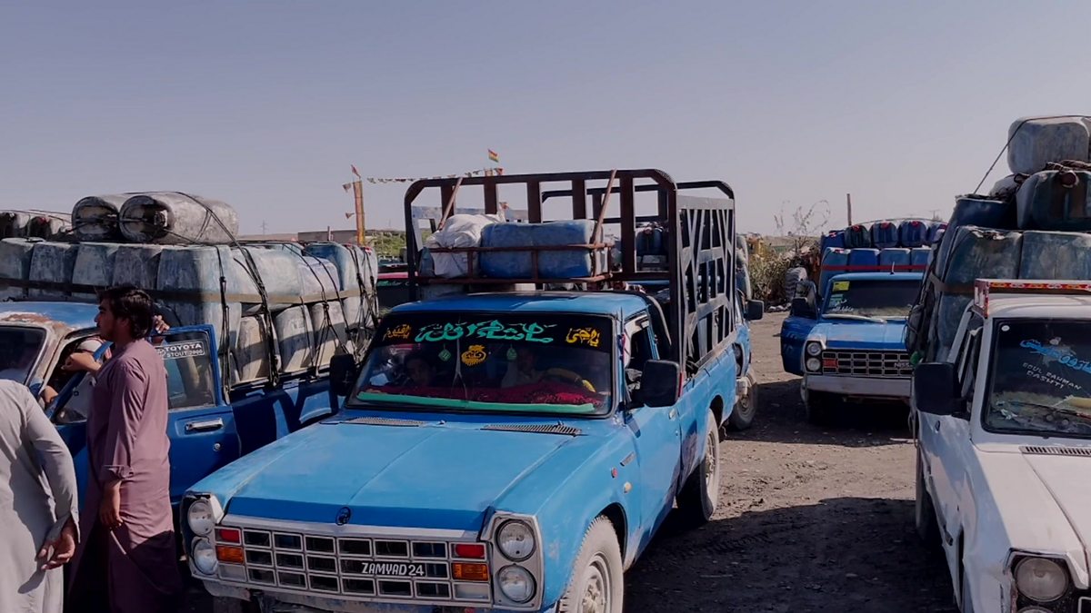 (Photo: Blue informal fuel trade trucks on Pakistani Balochistan border with Iran. Credit: BBC)