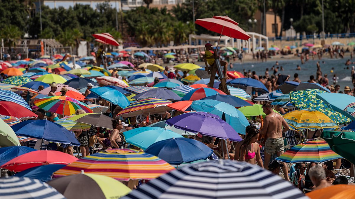[Photo: El Postiguet Beach in Alicante, Spain in the summer of 2022. Credit: Marcos del Mazo/LightRocket via Getty Images.]