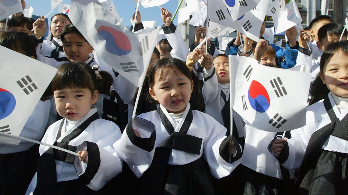 (Children wearing traditional costume wave national flags during a celebration in Seoul, South Korea. Credit: Chung Sung-Jun/Getty Images)
