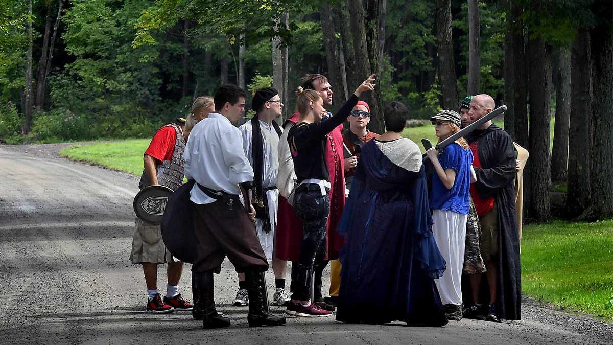 (Photo: A group of role players gather to make a plan as they are about to be attacked by another group during a Live Action Role Playing session (LARP), at Epic Nerd Camp. Credit: Michael S. Williamson/The Washington Post/Getty Images)