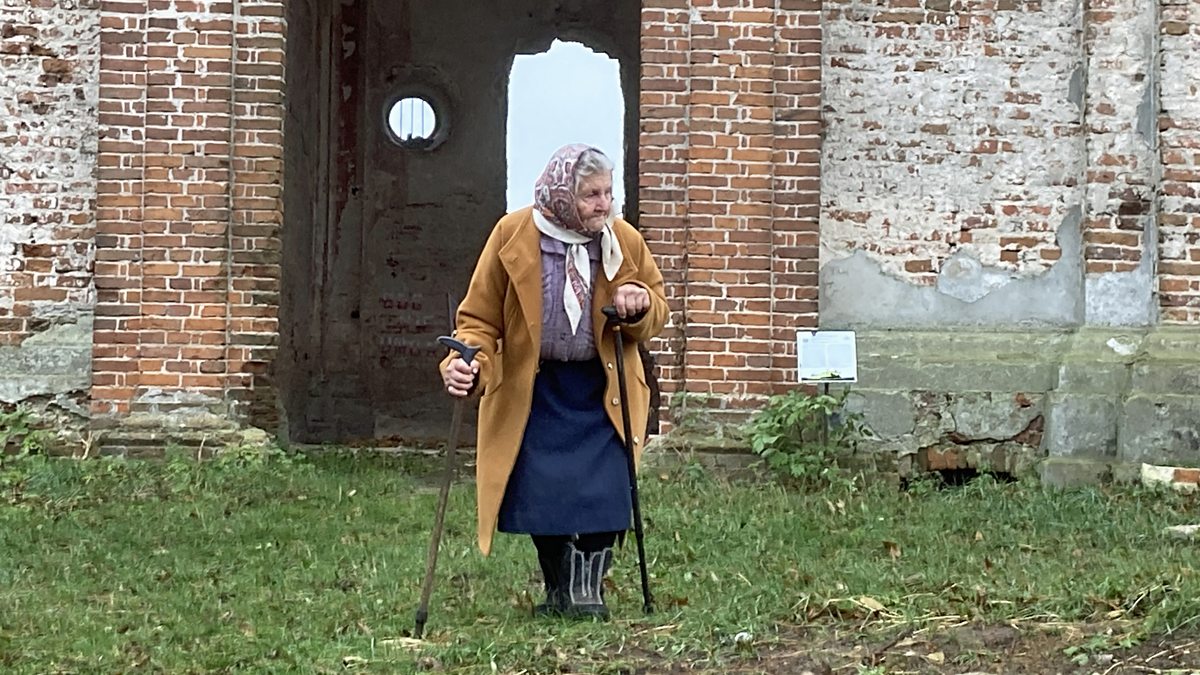 (Image: Lyudmila Hirska, aged 86, at the ruins of the Catholic church in Kysylyn (formerly known as Kisielin), Ukraine, where Poles were massacred in 1943. Credit: Tim Whewell/BBC)