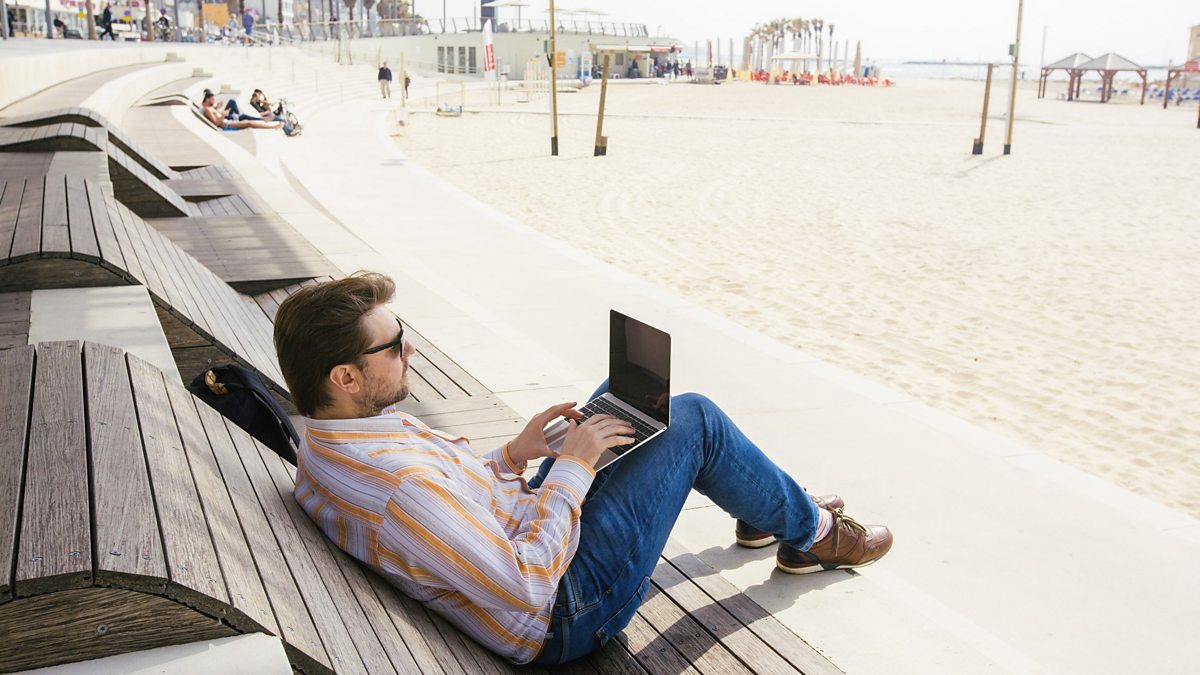 (Picture: Man using laptop sitting on a wooden sunbed on the beach. Picture credit: Getty Images)