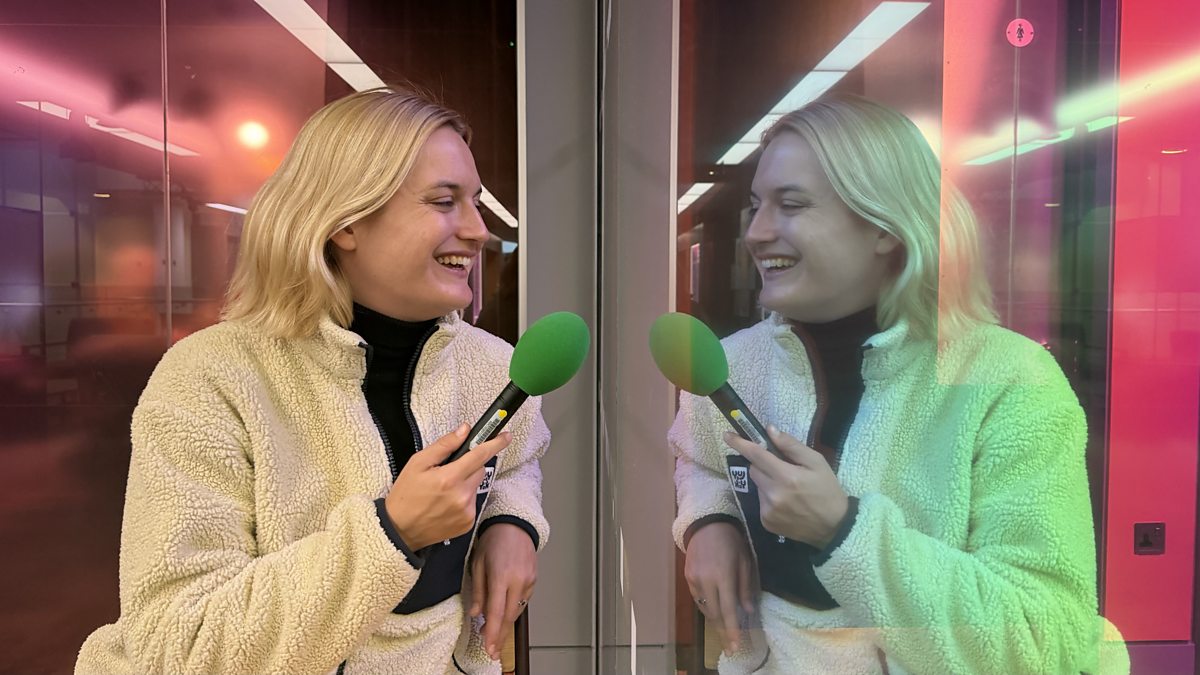 (Photo: Mirror image of presenter Caroline holding microphone Credit: BBC)
