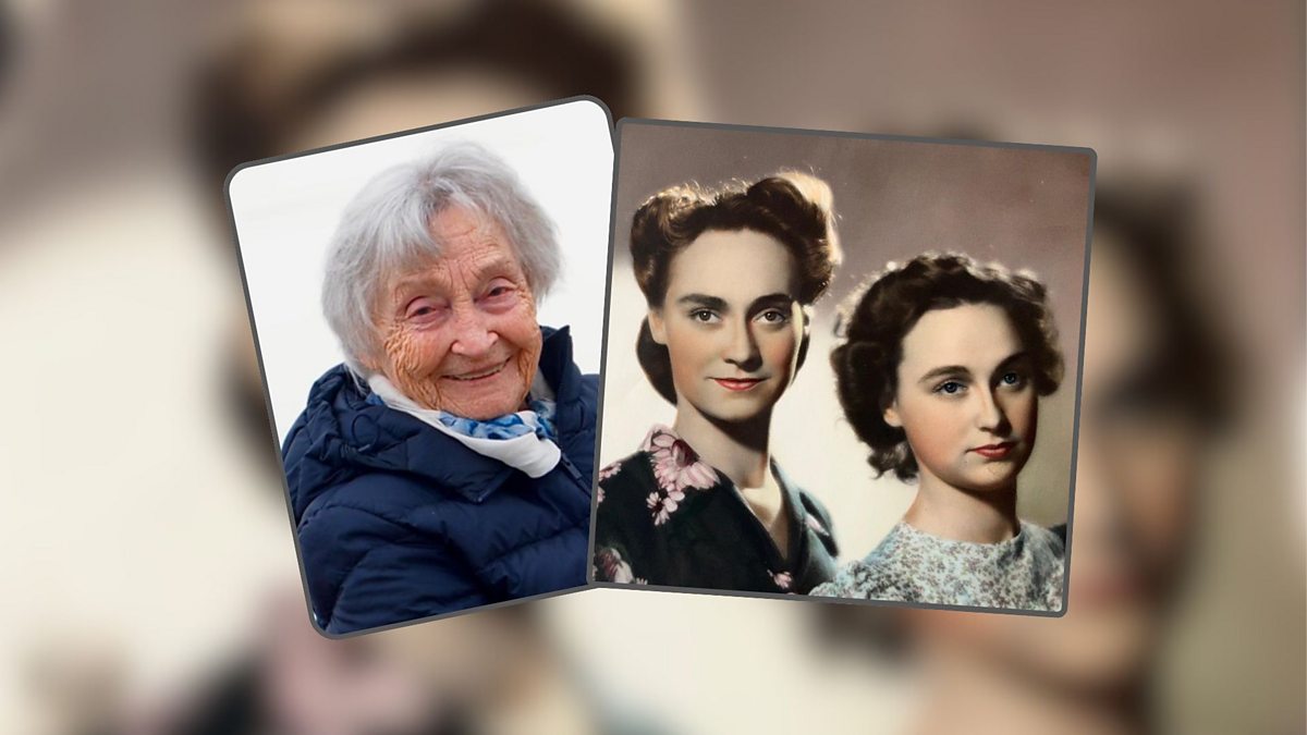 (Photo: A composite image of an old family photo of Ruth with her sister Minna as young women and an image of Ruth today in a blue hoodie, with short cropped grey hair and a big smile. Credit: Courtesy of Ruth Morton. And Graham Bound)