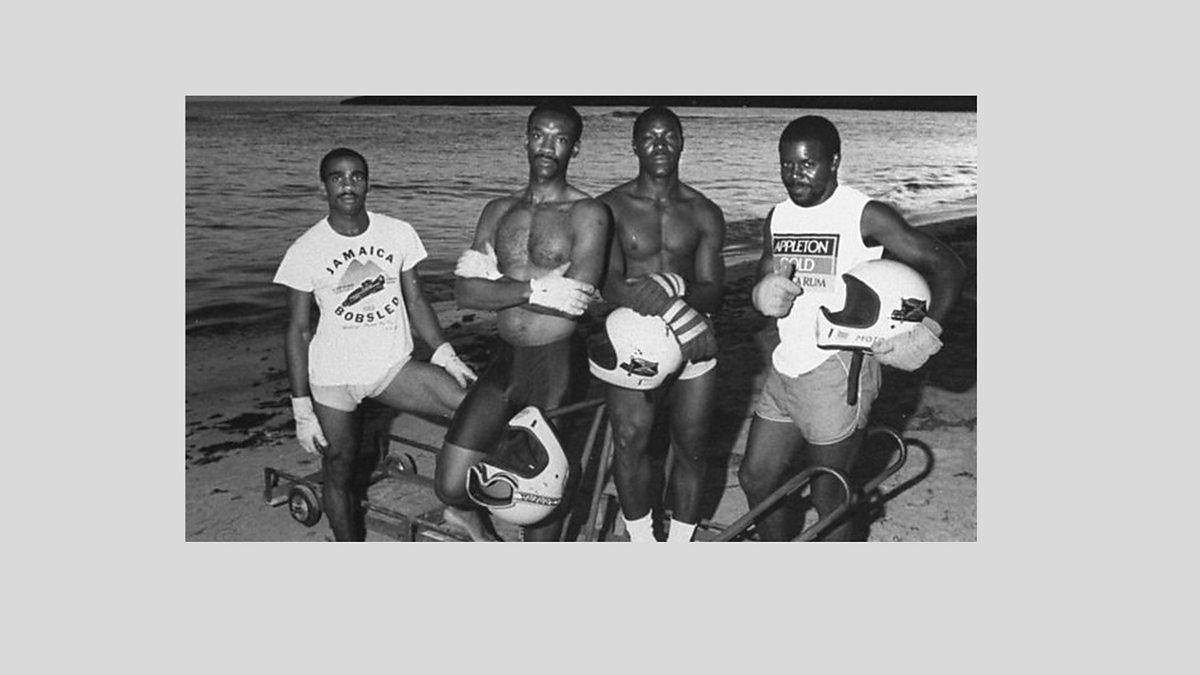 (Image description: Left to Right, Michael White, Dudley Stokes, Devon Harris and Frederick Powell. A black and white photo shows the 4 members of the 1988 Jamaican bobsled team on a tropical beach in Kingston. They are standing in front of what appears to be a training sled. They are holding helmets and wearing gloves. The two in the middle, which includes Devon Harris, are bare-chested, and the other two wear white t-shirts, one of which says Jamaica Bobsled. Credit: Will and Deni McIntyre/Getty Images)