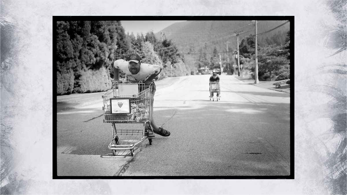 Murray Siple grew up in an outdoorsy town in Canada surrounded by rugged hills and timberlands. Sport, danger, and risk-taking were part of his life from the beginning, be it extreme sports like snowboarding or skipping school to explore logging towns on dirt bikes. While Murray was in art school he started filming extreme sports like snowboarding which ended up taking him all over the world. Filming put him in many extreme, risky situations; he was in an avalanche, a helicopter crash, and had to be resuscitated after drowning. One night he got into a car with a drunk driver and was in a serious car crash. Murray was paralysed and had to rethink his life going forward. He poured his feelings into new art pieces and found fresh perspectives on the world. One night he heard someone going through his recycling bin; it turned out to be a homeless man looking for bottles to exchange for money. Murray discovered that he was part of a group of men who race shopping carts down the steep hills of North Vancouver at high speed. Suddenly Murray had a whole new group of risk-taking outsiders to film and his injury saw him welcomed into the community with open arms.