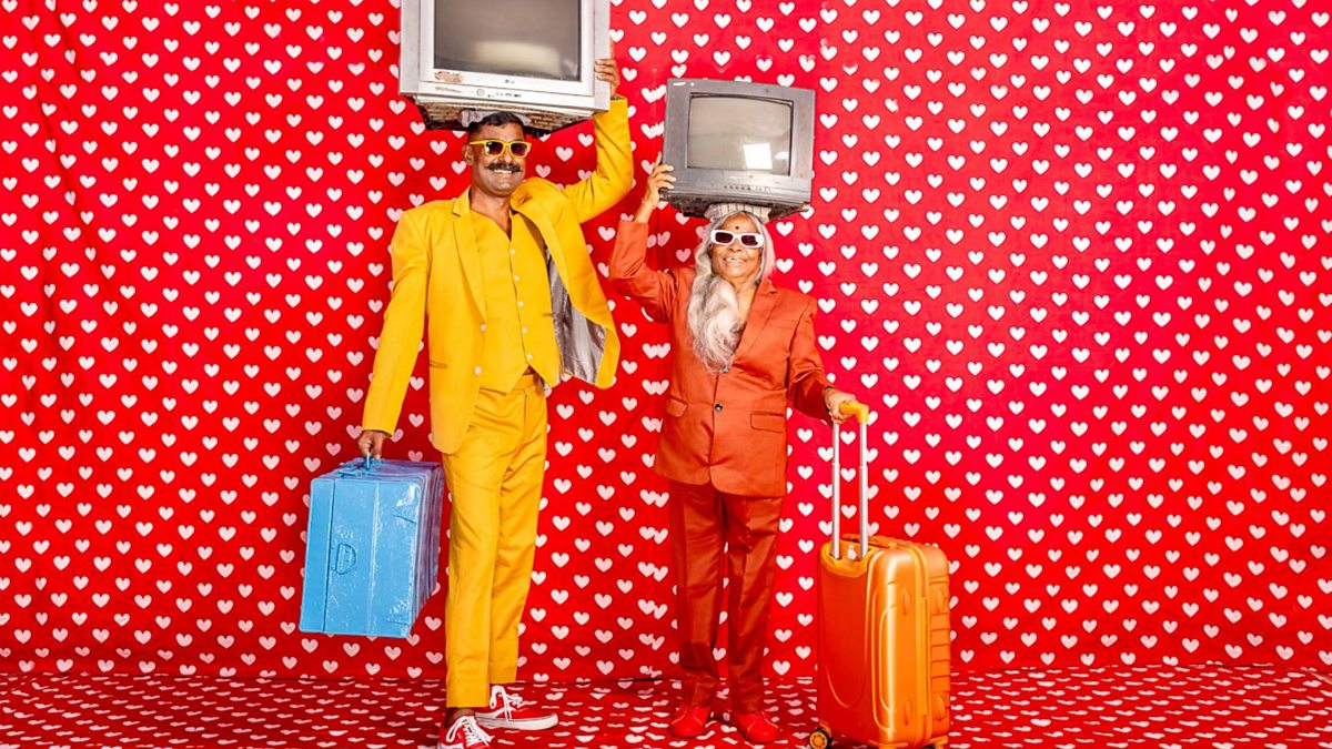 Photo: Indian photographer Cop Shiva wears a yellow three-piece suit, standing beside his white-haired mother who also wears a man's suit in bright red. They pose against a red wall and floor uniformly patterned with white hearts creating an intense backdrop. Mother and son are smiling and holding suitcases in their hands, and old-fashioned televisions balanced on their heads. Credit: Cop Shiva