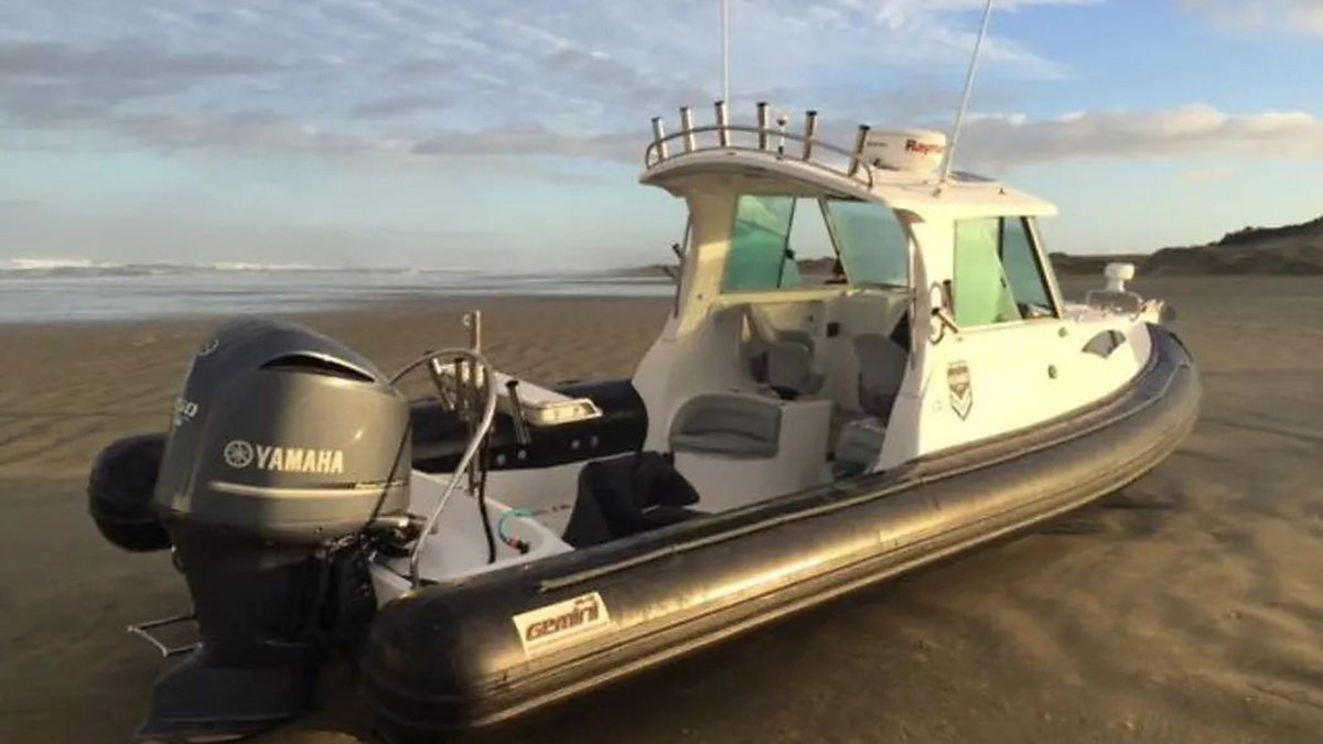 (Photo: Photo: The rigid inflatable boat used by the criminals left high and dry on a stretch of 90 Mile Beach.