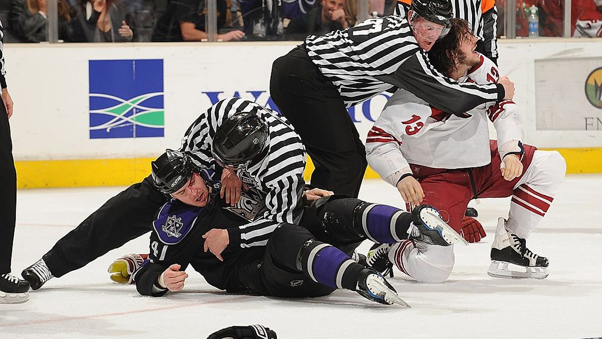 Photo: Raitis Ivanans #41 of the Los Angeles Kings and Daniel Carcillo #13 of the Phoenix Coyotes are restrained by the officials during their game at Staples Center on Feburary 18, 2008 in Los Angeles, California. (CREDIT: Juan Ocampo/NHLI via Getty Images)