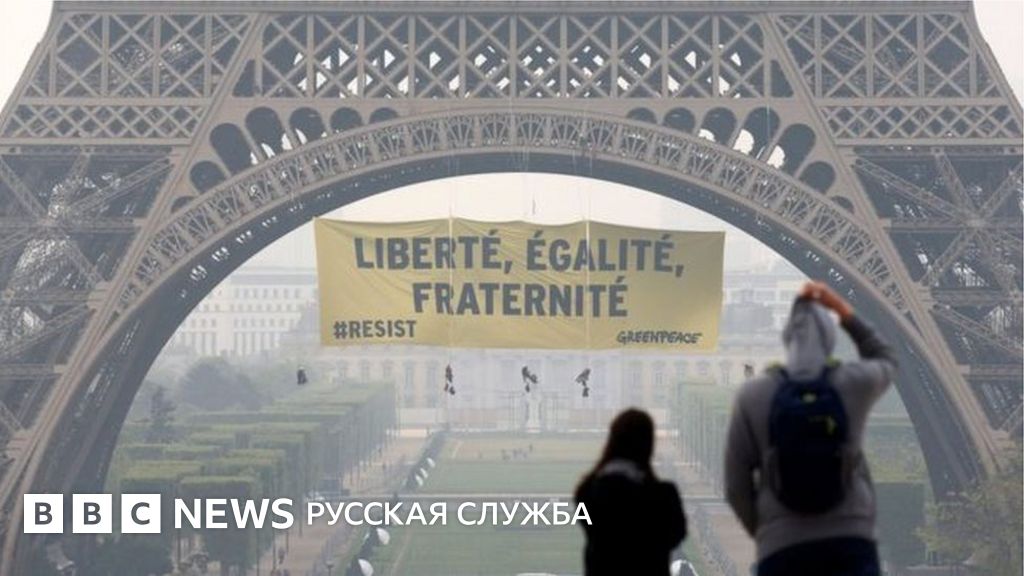 Группа активистов "Гринпис" взобралась на доминирующее над французской столицей знаменитое сооружение и вывесила на его северной стороне лозунг: "Свобода! Равенство! Братство!"