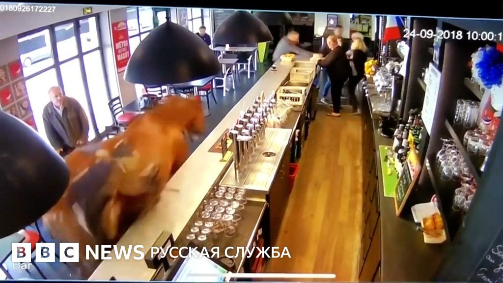 Во Франции молодая скаковая лошадь сбежала от своего жокея, забрела в спорт-бар и напугала его посетителей.