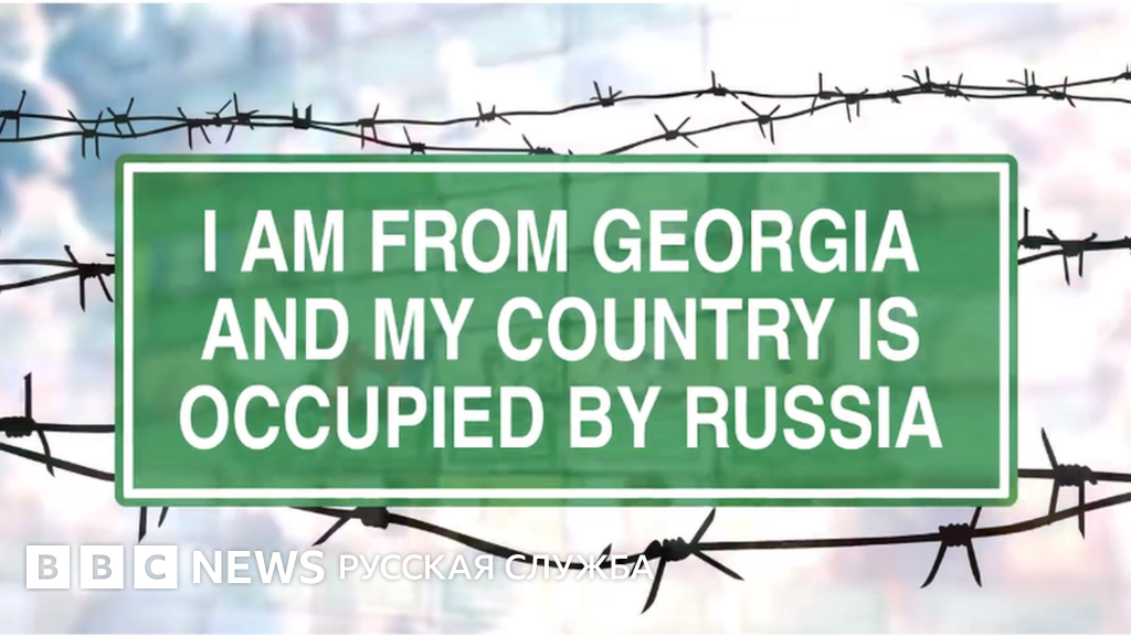 Фраза о российской оккупации на фоне колючей проволоки отсылает к пограничным знакам и ограждениям, установленым на непризнанных границах с отколовшимися от Грузии регионами.