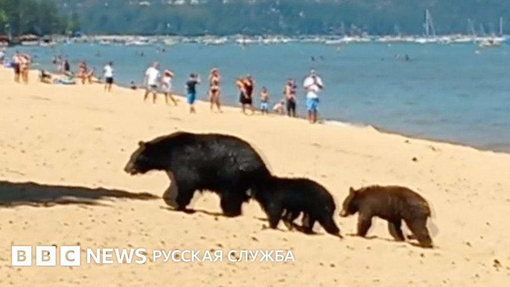 Медведица с медвежатами пришла на многолюдный пляж в Калифорнии, чтобы искупаться.