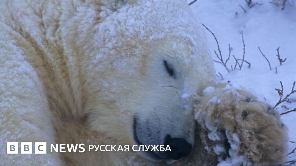 Белый медведь в зоопарке Портленда играет в снегу