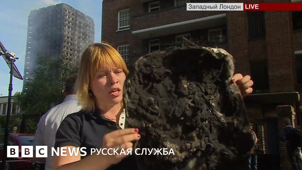 Корреспондент Русской службы Би-би-си Ольга Ившина, которая побывала около сгоревшей лондонской высотки, показывает фрагмент обшивки здания, прилетевший к ней незадолго до прямого включения в выпуске наших телевизионных новостей.