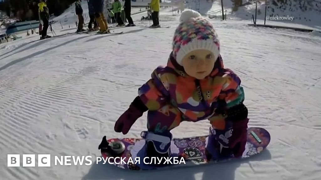 Годовалая девочка из американского штата Айдахо впервые катается на сноуборде - и у нее получается.