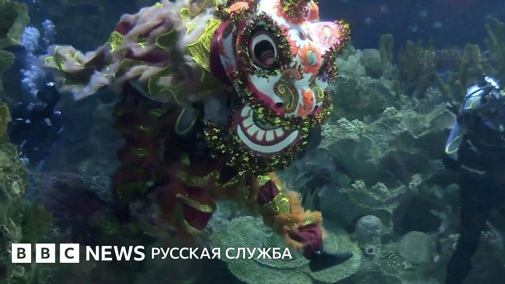 Китайский Новый год в малайзийском океанариуме. Танец льва с акулой