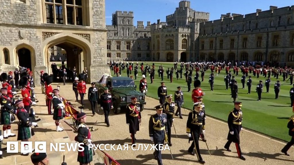 Королева на машине прибыла в часовню Святого Георга на территории Виндзорского замка, в то время как его четверо детей и трое его внуков, включая принцев Уильяма и Гарри, шли вдоль гроба. Катафалк перевозили в модифицированном "лэндровере".