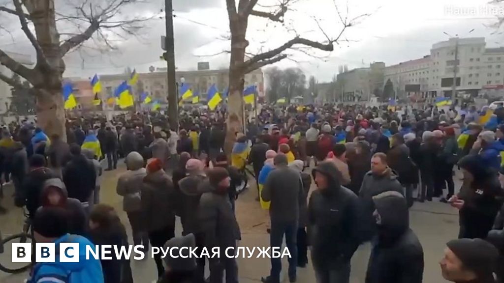 В Херсоне люди вышли на антивоенный митинг. Люди скандируют, что Херсон - это Украина и что они не боятся.