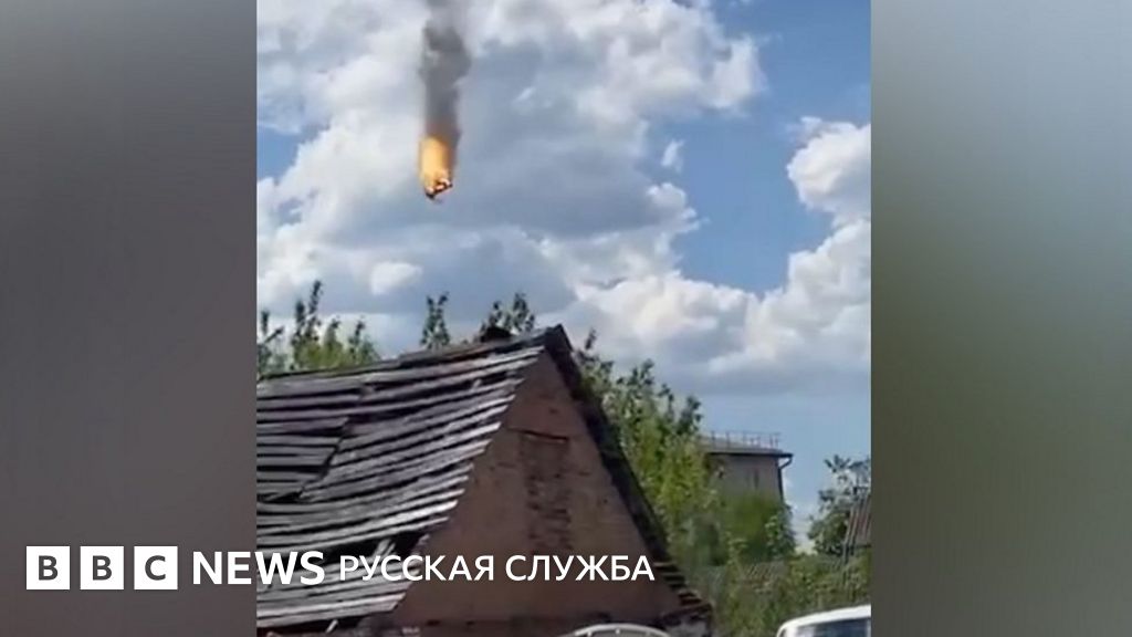 Очевидцы из Брянской области публикуют видео с падением летательных аппаратов. На одном из роликов видно, как вслед за горящим вертолетом вниз летят лопасти. На другом - горящие обломки самолета.