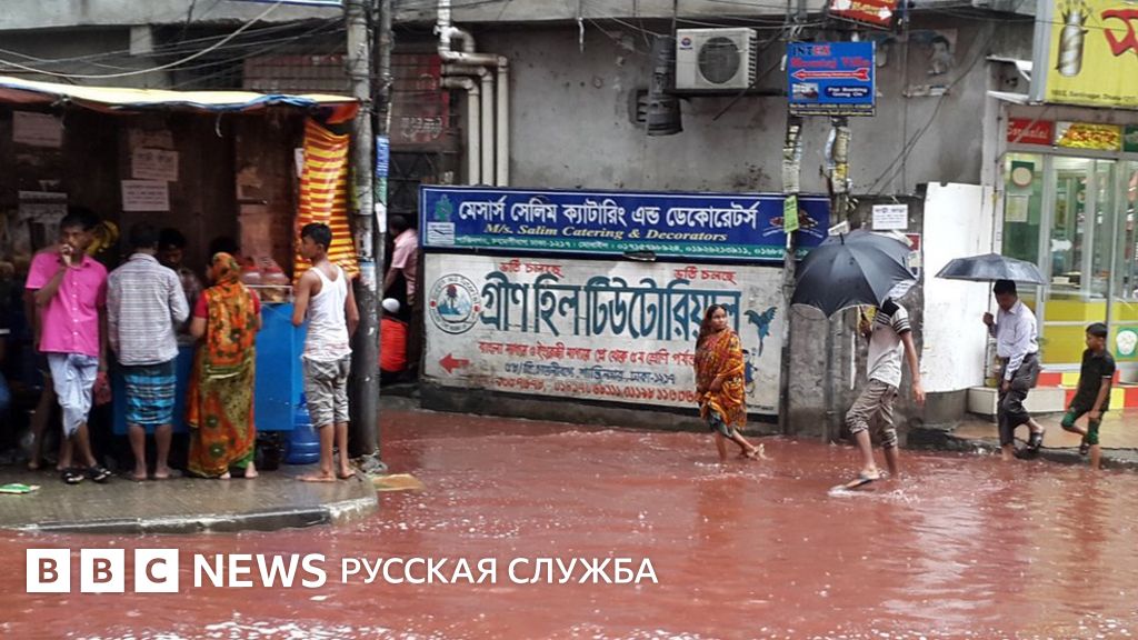 Затопленные в результате сильных дождей улицы столицы Бангладеш Дакки окрасились в красный цвет после масштабного забоя животных в честь мусульманского праздника Курбан-байрам.