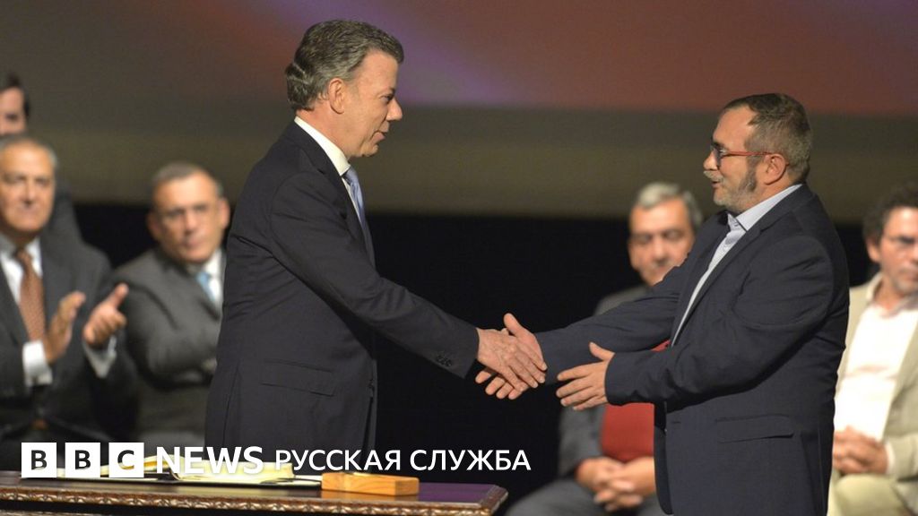 Президент Колумбии Хуан Мануэль Сантос и лидер повстанческой группировки ФАРК Родриго Лондоньо подписали мирное соглашение.