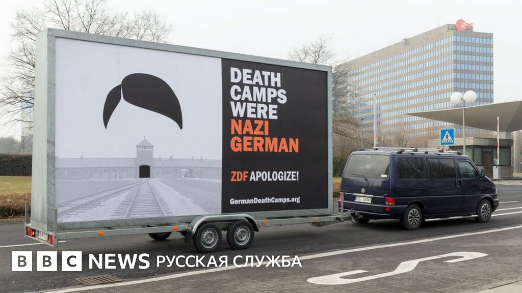На билборде крупными буквами написана фраза: "Лагеря смерти принадлежали нацистской Германии. ZDF, извинитесь!"