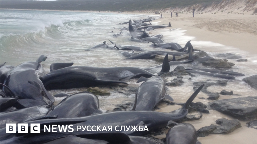 Около 150 короткоплавниковых гринд - морских млекопитающих семейства дельфиновых - выброшены на берег в Австралии. Идет масштабная спасательная операция.