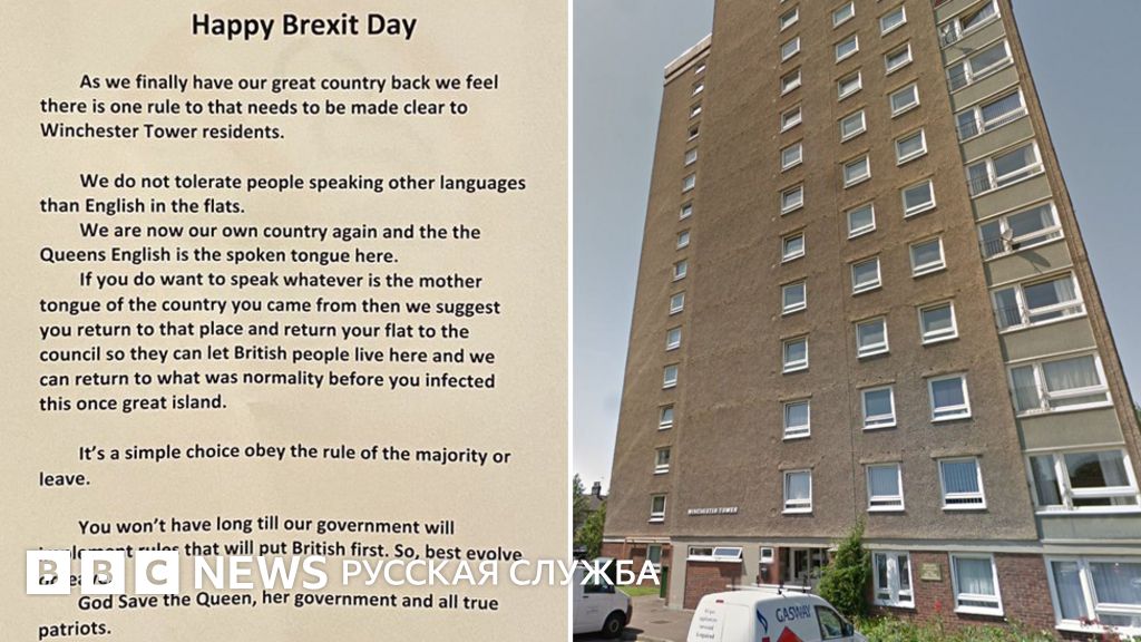 Напечатанное на компьютере объявление под названием "Счастливого брексита" было приклеено к пожарным щитам на всех 15 этажах дома дома в пятницу - в день, когда Британия официально вышла из состава Евросоюза. Это Би-би-си подтвердил один из жильцов.