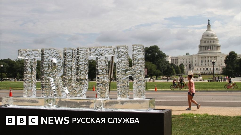 Ледяная скульптура слова "Правда" (Truth) весом в тонну эффектно растаяла перед зданием Капитолия в Вашингтоне субботу, 22 сентября Скульптура - это протестная инсталляция художников Маршалла Рииса и Нора Лигорано против состояния политики в эпоху "фейковых новостей" при президенте Дональде Трампе.