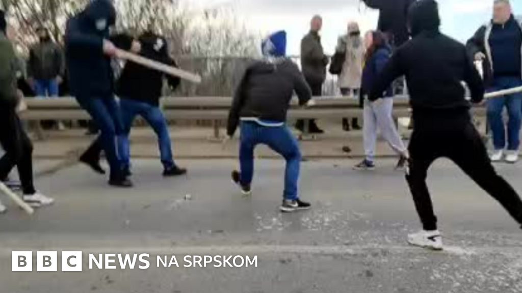 Vidi se kako grupa mlađih ljudi motkama napada demonstrante, kao i bagerista sa još jednim muškarcem koji ide na ljude.