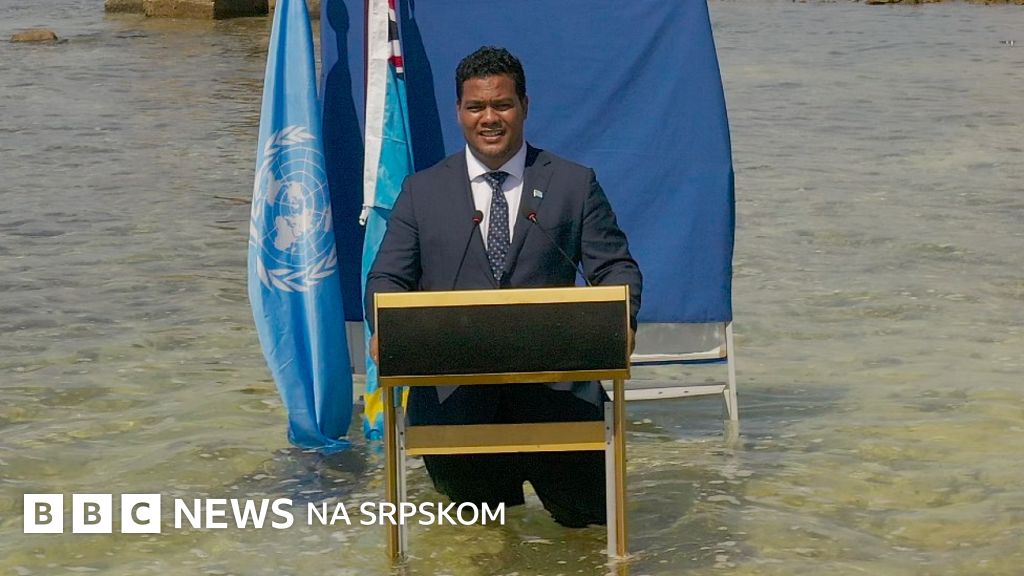U odelu, u vodi do kolena, na mestu koje je pre mnogo godina bio suv teren, ministar ostvrske zemlje Tuvalu u Pacifičkom okeanu poslao je dramatično poruku.