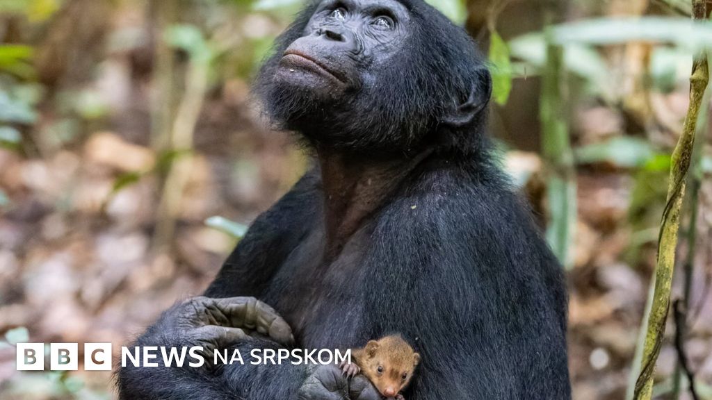 Čini se da slika prikazuje bonoba koji mazi malog mungosa poput dragog ljubimca.