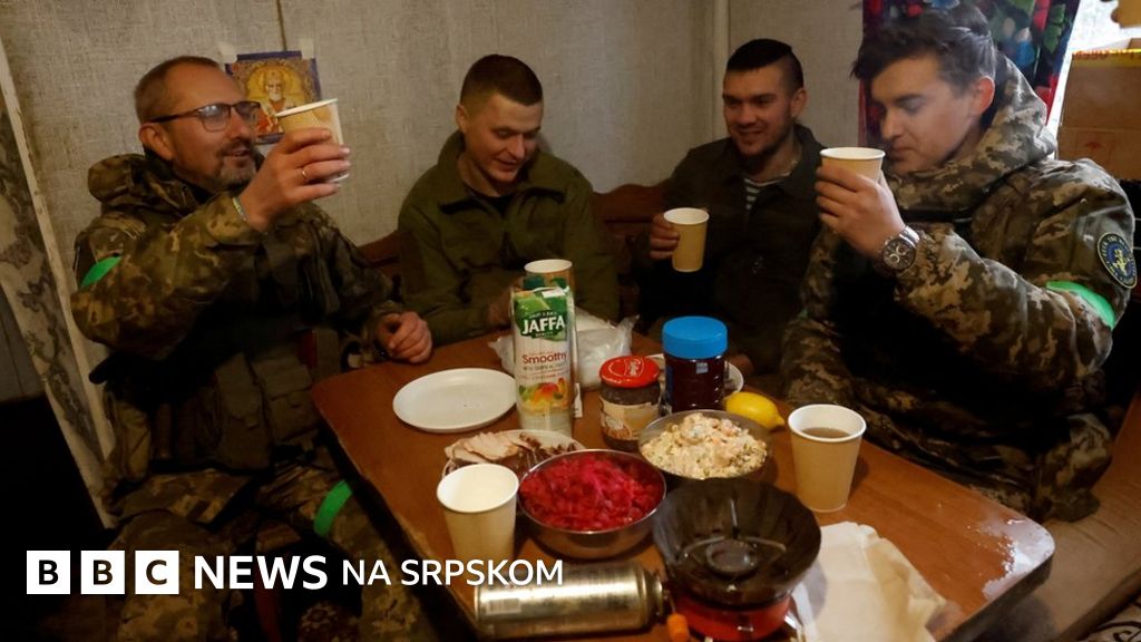 Potpis ispod fotografije, Širom Ukrajine, slavlje je pomutio rat. Ukrajinske trupe u blizini fronta u regionu Donbasa nazdravljaju tokom kratkog predaha.