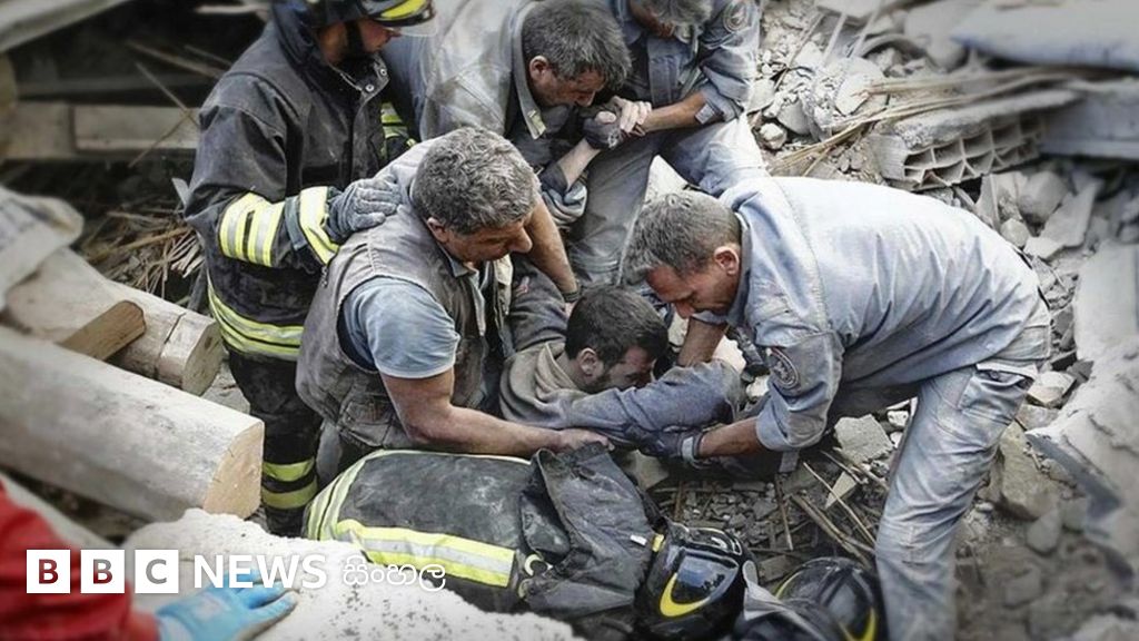 ඡායාරූප ශීර්ෂ වැකිය, සුන් බුන් වලට යට වී සිටි අයෙකු බේරා ගනිමින් වීඩියෝ ශීර්ෂ වැකිය, Rescuers in Amatrice have been trying to reach survivors amidst the rubble