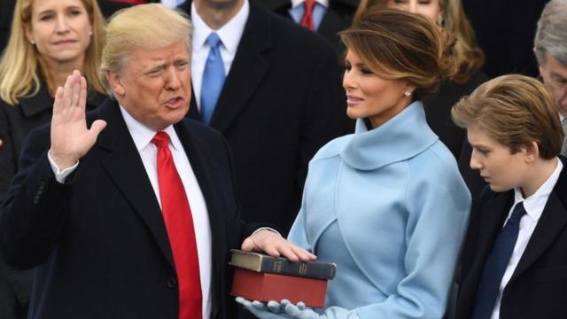 Sawirka madaxweynaha cusub markii la dhaarinayay. Waxaa barbar taagan xaaskiisa Melania iyo wiilkiisa Barron.