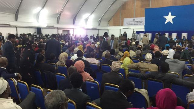 Sacab xoog leh ayaa is qabsaday gudaha hoolka, rasaas dabaal deg ahna gudaha magaalada ayaa laga maqlayaa. Weli lama xaqiijin laakin mid ka mid ah murashaxiinta wareegga labaad ayaa tirinta codadka aad ugu horreeya. sida uu ku soo waramayo weriyaha BBC, Faarax Lamaane oo ku sugan hoolka uu shirku ka dhacayo