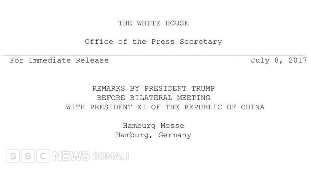 Qoraalka oo soo baxay ka dib markii uu madaxweyne Trump kula kulmay dhigiisa Shiinaha shir madaxeedkii G20, ayaa waxa uu Xi Jinping ku sheegay inuu yahay madaxweynaha "Jamhuuriyadda Shiinaha".