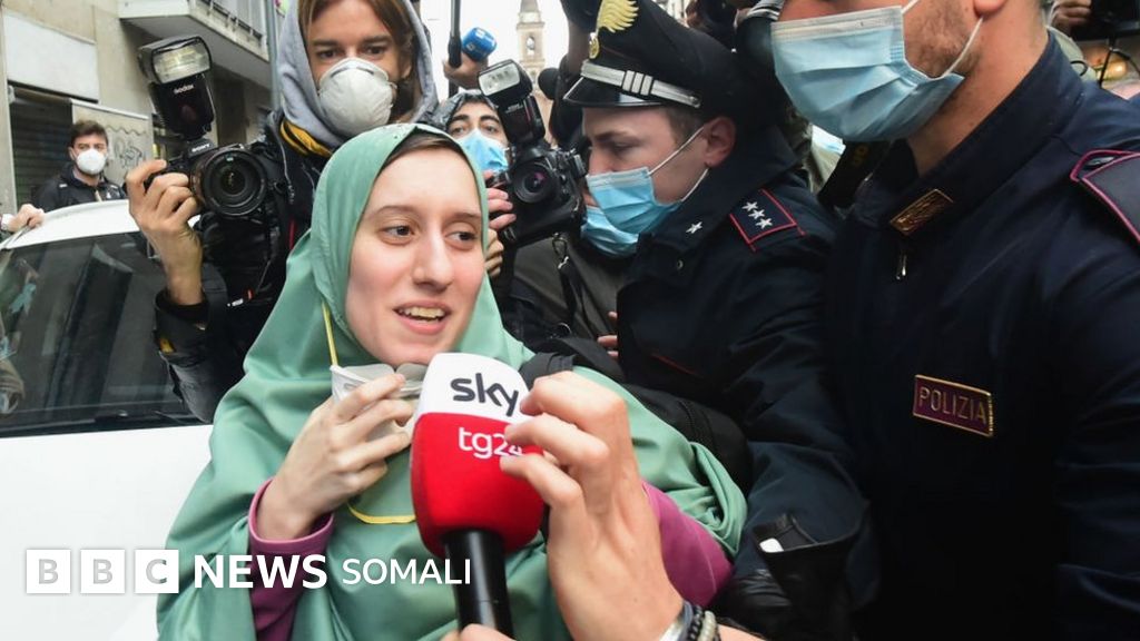 Silvia Romano, 25 jir ah waxay Axaddii ka dagtay Talyaaniga iyadoo xiran xijaab cagaaran, oo u eg haweeney Soomaali ah.