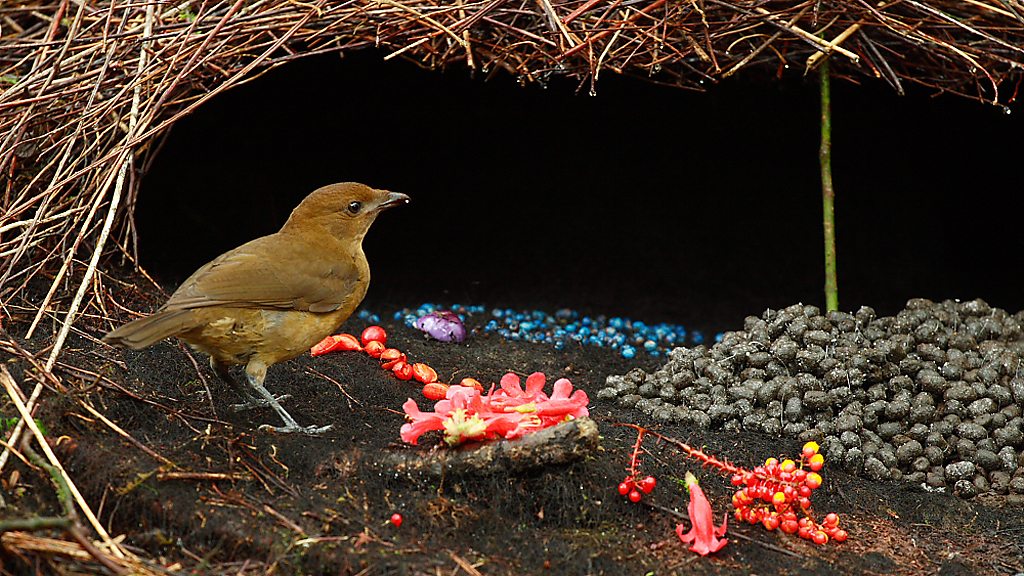 Wildlife film director Stephen Lyle is joined by cameraman Barrie Britton to recall their close encounter with two birds that revealed the sculpting of ornate structures and singing of songs beyond the vocal range of human beings in the courtship performance of the male vogelkop bowerbird. Making sense of the biology is Dr Joah Madden of Exeter University, who has spent the last ten years studying this sexual display.