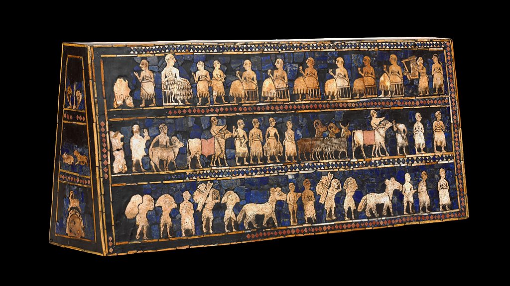 Neil MacGregor with this week's examination of the first great civilisations with one of the most spectacular discoveries of ancient royal goods. The magnificent gold and silver jewellery was found nearly 100 years ago at a royal burial site in the City of Ur in Southern Iraq, at the heart of one of the first great civilisations in the world. It leads Neil MacGregor to contemplate the nature of kingship and power in Mesopotamia. The Standard of Ur is a set of mosaic scenes that show powerful images of battle and regal life and that remain remarkably well preserved given its fourand a half thousand year old history. Contributors include sociologist Anthony Giddens, on the growing sophistication of societies at this time, and the archaeologist Lamia Al-Gailani who considers what Ancient Mesopotamia means to the people of modern day Iraq.