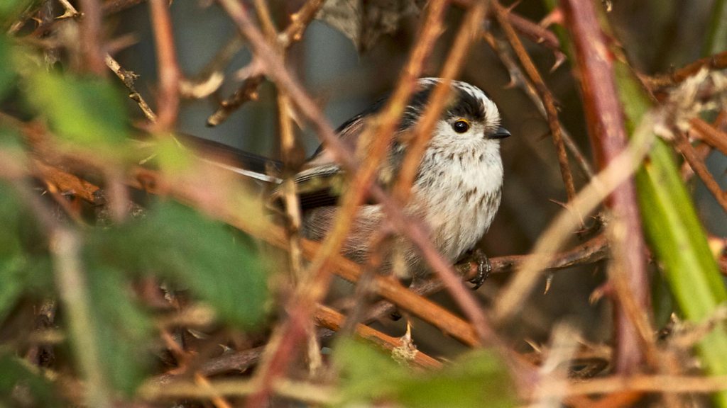 Seeing a flock of black and white striped, powder puff pink flanked long-tailed tits bouncing through the grey and brown winter landscape is a cheering sight. Scruffy and bandit faced they are often heard before they are seen with piping calls to keep the flock together. Charging around in family groups these diminutive birds will spend the coldest winter nights roosting together, lined up along a branch jostling for the best position. These groups, determined by behaviour in the breeding season, are essential to winter survival. Adults that were unable to raise a brood themselves help out other more successful family members as currency to spend the winter as part of the flock. Naturalist John Walters takes Chris Sperring to the southern fringes of Dartmoor to introduce him to one particular family group. Produced by Ellie Sans.