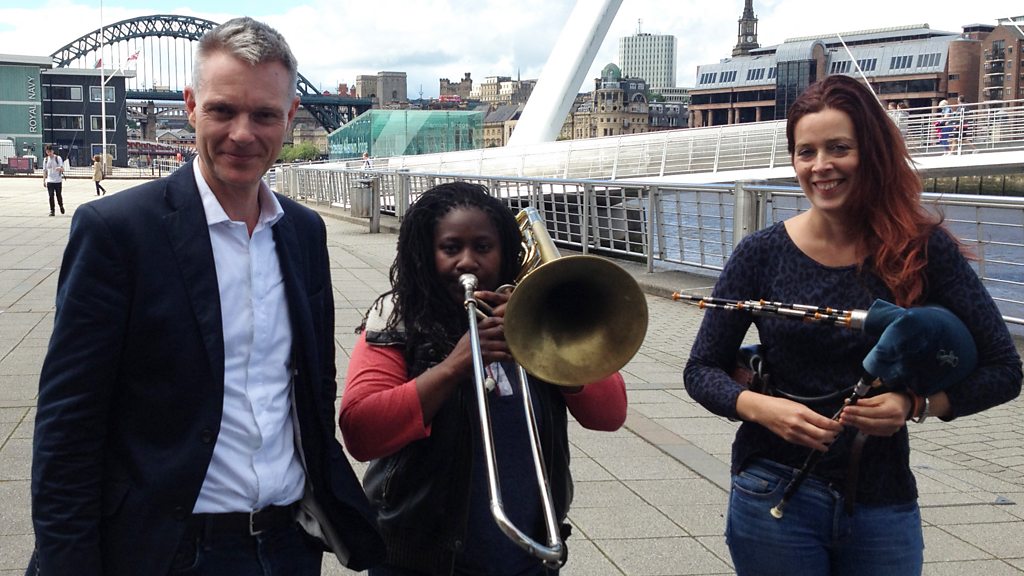 In 'Playing the Skyline' Tim Marlow joins two musicians as they look at how the land meets the air, and imagine it as music. They give their responses, then begin playing the skyline, before creating new pieces. Later, Tim hears how they are getting on and, finally, the musicians, Tim and Radio 4's listeners hear their finished works. On old nautical charts as well as the bird's eye view there is often a coastal profile - the outline of the land seen from the point of view of a sailor approaching it. Radio producer Julian May was struck by the musicality of these, the undulations of hills are melodic, the spacing of landmarks - trees, spires - rhythmic. Musicians could, he thought, take the line dividing the earth from the air, place it on a stave - literally or imaginatively - and play the skyline. In the first of this new series Kathryn Tickell and Hannabiell Sanders turn the skyline of Newcastle into music. At the old Baltic flour mill by the Tyne they look upstream, where the great curves of the Sage Concert Hall and the bridges meet, to be end-stopped by the square solidity of the castle, from which the city gets its name. Kathryn Tickell is steeped in the traditional music of Northumberland. She plays the region's indigenous instrument, the Northumbrian Smallpipes. So her music, she says, "always speaks in the accent of the Northeast." Hannabiell Sanders' accent is very different. Her father is Jamaican and she was born in the American South. How would she describe her music? "Psychedelic Afro-funk jazz fusion!" Hannabiell's bass trombone (called Tyler) can glide smoothly over the curves of Newscastle's skyline, something tricky for Kathryn, on the pipes it is impossible to slide from one note to another. Producer: Julian May.