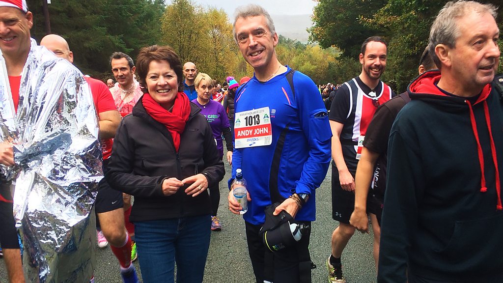 Helen Mark follows Snowdonia Marathon and meets some of the people tackling this challenging course. Starting and finishing in Llanberis, the race encircles Wales' highest mountain of Snowdon, and rises to over a thousand feet in places. Andy John, Bishop of Bangor is taking on the Marathon for the third time, and he describes the sensation from running the course as being lost in the landscape but found in yourself. But he's dreading the twenty-two mile mark when he'll reach the 1200ft climb at Bwlch y Groes or "gap of the cross", before descending back into Llanberis for the finish. Helen stops at the ten-mile mark to meet Arwyn Owen at Hafod y Llan farm to find out how Hydro-Electric Power is the new cash crop in this rugged environment. She also meets Phil Owen at Llechwedd Caverns to discover how the area became the slate-mining capital of the world. Both Phil's Father and Grandfather worked in the mine, but Phil became a musician and serenades Helen on his ukulele, three hundred feet below the surface. Helen hands out water and energy gels with volunteers from the Snowdonia Society at the halfway point in Beddgelert and speaks to Margaret Thomas about Esme Kirby, the remarkable woman who set-up the organisation, before returning to Llanberis to greet a weary Andy John as he's crosses the finishing line.