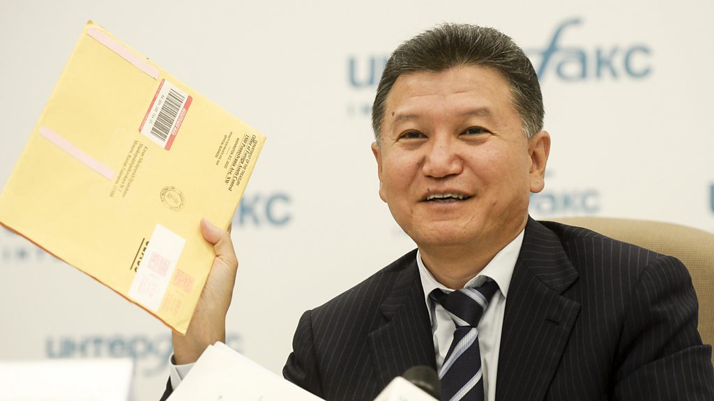 The bizarre and extraordinary story of Kirsan Ilyumzhinov, the eccentric Russian tycoon and president of FIDE, the international chess governing body. His twenty years in office have been dogged by allegations of corruption and vote-rigging and he’s recently been banned from entering the United States by the US Treasury for his alleged involvement in assisting the Assad regime in Syria. It’s prevented him from presiding over this month’s World Chess Championships in New York. For Assignment Tim Whewell reports from Moscow and New York on the deeply politicised game of chess and asks if it’s finally checkmate for the king of chess. Dina Newman producing. Photo: Kirsan Ilyumzhinov with the letter from the US Treasury informing him why he had been placed under US sanctions. Credit: K.Ilyumzhinov’s archive