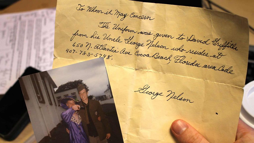 Proinsias O'Coinn was a teenager on a rare shopping trip to Belfast when he stumbled across a vintage military shop. Hidden among the old fatigues, army garb and war memorabilia, he found a jacket he just knew he had to have. It smelt old and musty but he didn't care. It seemed different, authentic, well-made, smart - the kind of jacket that someone would have worn with pride. So Proinsias bought it. On the train on the way home, he put his hand into the pocket and found a letter - "To whom it may concern. The uniform was given to David Griffiths from his uncle George Nelson who resides at N. Atlantic Ave Cocoa Beach, Florida. Signed, George Nelson" At that moment Proinsias knew he needed to return the jacket to its rightful owner. But more than a decade later, nothing can prepare him for what he's about to discover. Producer: Conor Garrett.