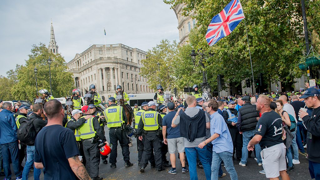 The Democratic Football Lads Alliance describes itself as an anti-extremist group of football supporters with a commitment to raising funds for the homeless and social justice campaigns. But critics say it’s a far right organisation which has an anti-Islamist agenda. Its marches and demonstrations have attracted rival groups of anti-fascists and have resulted in skirmishes. The Premier League says it has raised its concerns with the UK Football Policing Unit and the Home Office. There are also worries that closed DFLA Facebook groups are being used as a platform to promote anti-Muslim hatred and anti-migrant rhetoric and violence. Photo credit: Ollie Millington\Getty