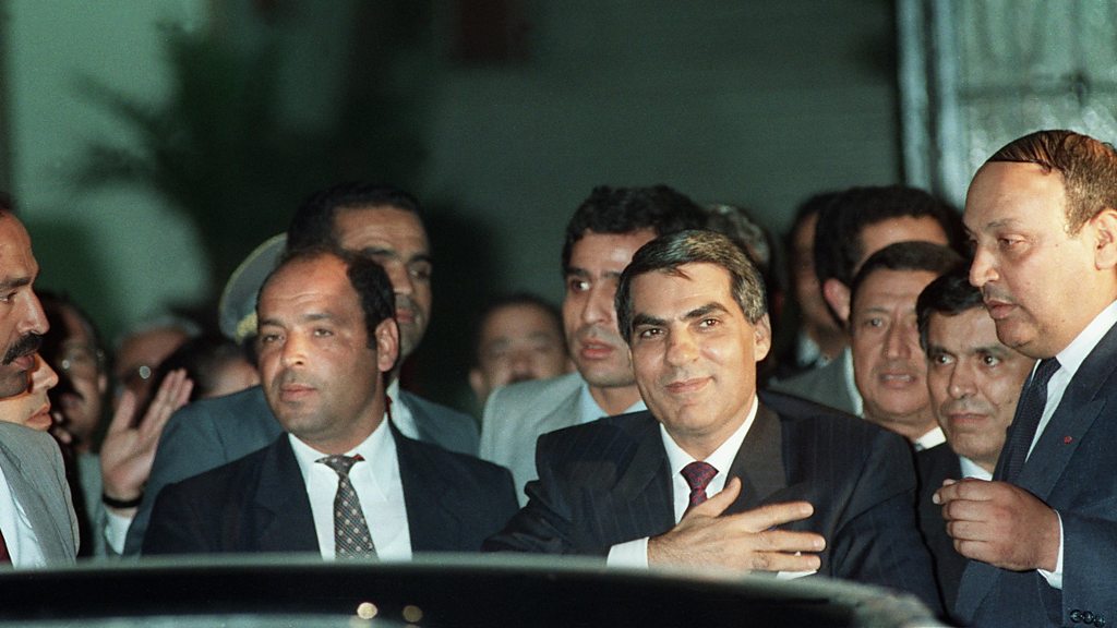 In 1987, Tunisia's long-serving president was toppled in a political coup, and replaced by his prime minister - by Zine al-Abidine Ben Ali. (Photo: Former Tunisian Prime Minister Zine el-Abidine Ben Ali (4th R) smiles to the cheering crowd 07 November 1987 in Tunis after being sworn in as President of Tunisia.) (Credit: JOEL ROBINE/AFP/Getty Images)