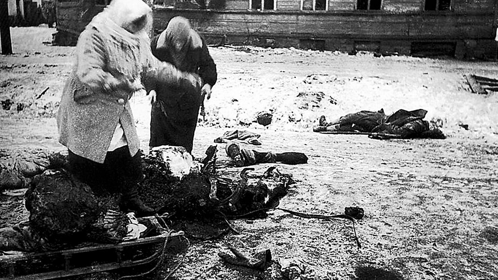 When Leningrad was cut off from the rest of Russia by German troops during World War Two, one third of its population died. Some were killed in the fighting, but most died of hunger. (Photo: Two women collect remains of a dead horse for food, during the siege of Leningrad) (Credit: World History Archive/TopFoto)